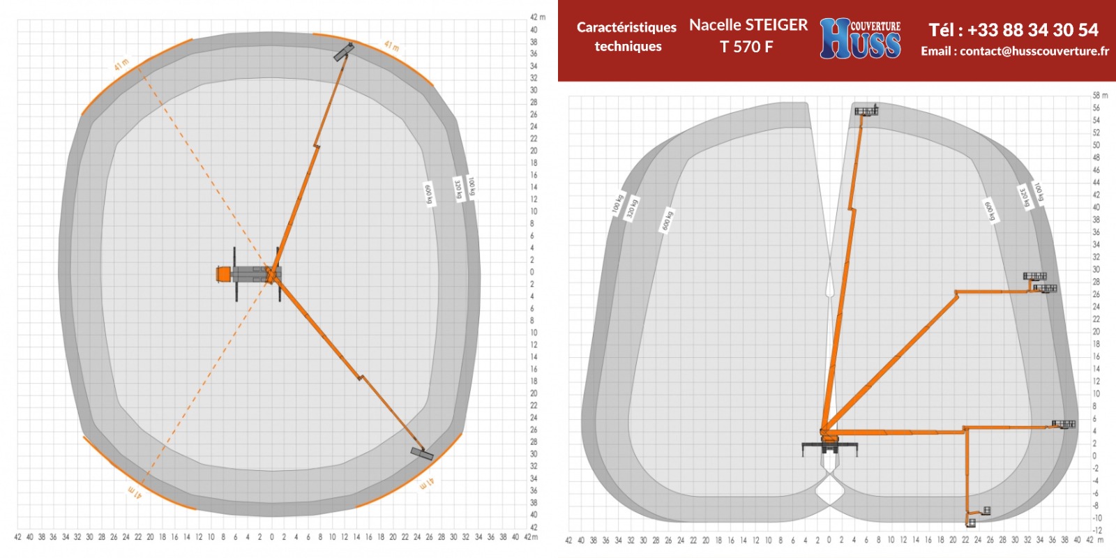 Huss Couverture, Artisan Couvreur Zingueur vous propose la location de notre nacelle disposant d'un déport maximum de 41 mètres et d'une hauteur maximum de 57 mètres pour tous vos travaux de grande hauteur ou difficiles d'accès